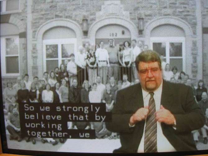 Det var ikke mulig å få tak i tegnspråktolk, men han var likevel på Bryggens Museum og holdt et halv times innlegg, med litt "internasjonal tegnspråk" og der storparten av opplegget var viet powerpoint presentasjon og litt film som viste et eksempel på god total-tilgjengelighet av video-presentasjon på museer: Bilder i bakgrunnen samt tekst og tegnspråk. Og naturligvis lyd (tale). DVD-videoen er fra DeafWay II i USA sommeren 2002. Det var derfor en unik sjanse til å få vist de ansvarlige i Norden hva som kan gjøres mht tilgjengelighet for døve og hørselshemmede.