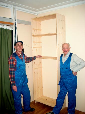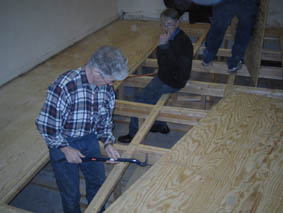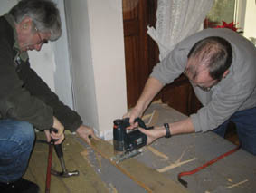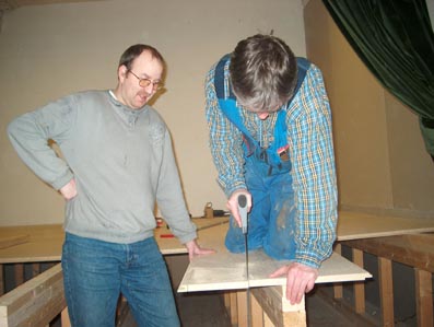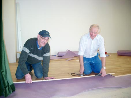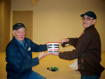 Erling og Sverre ble ferdig med å legge parkettene på scenegulvet. (Harry Ellingsen og Erling begynte med det kvelden i forveien.)
