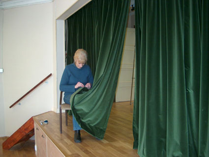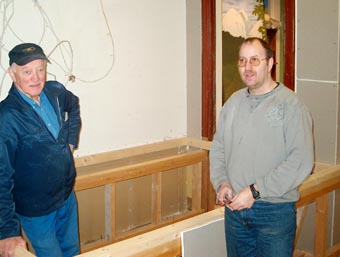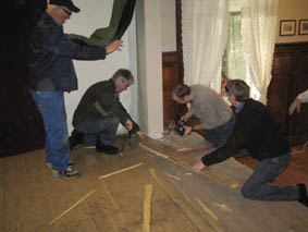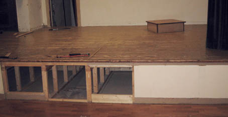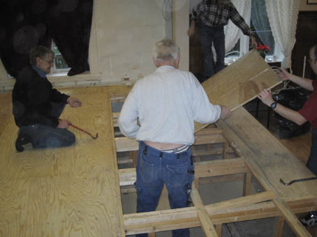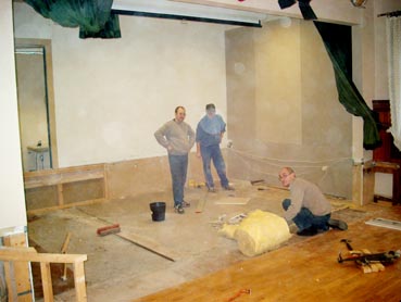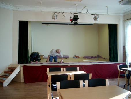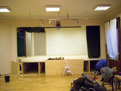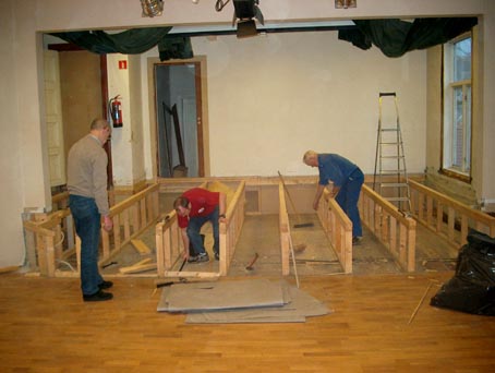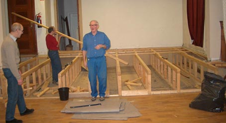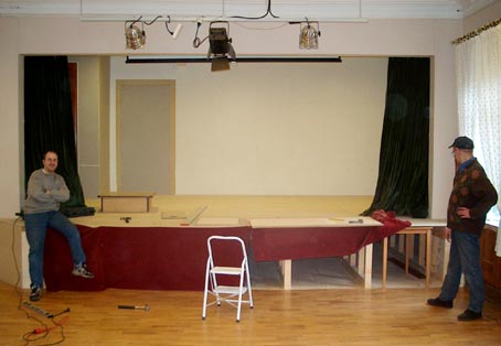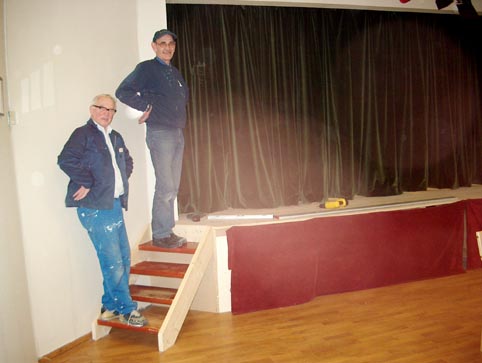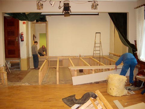 En dugnadsgjeng stilte opp og "rev av" scenegulvet i storsalen 9. januar. Innen to uker skal scenegulvet heves ca 10 cm, og under scenegulvet skal det være noen vogner der man kan plassere bord og stol og trille dem inn. Heretter skal man slippe å se bord og stoler stablet sammen oppå scenen. 09.01: