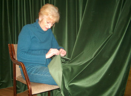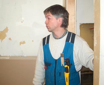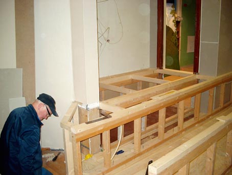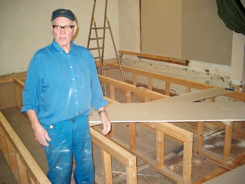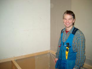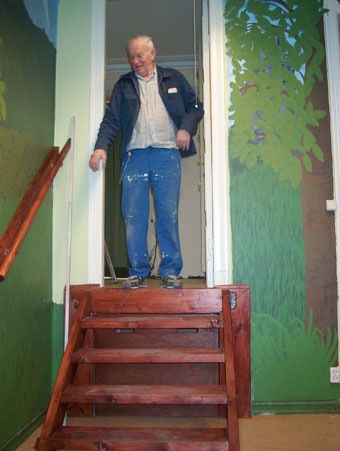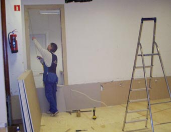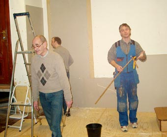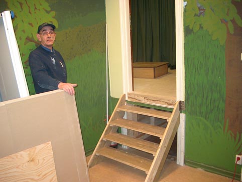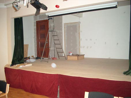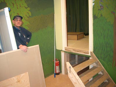 Spakling. Så blir det pussing og maling av veggen bak scenen, samt tapetsering på sidene.