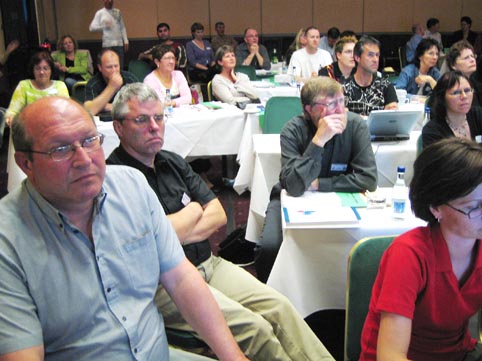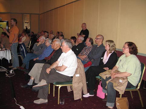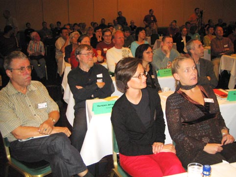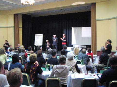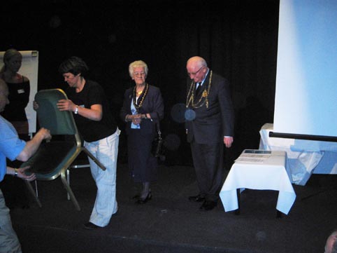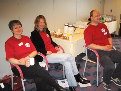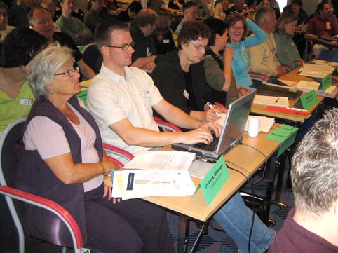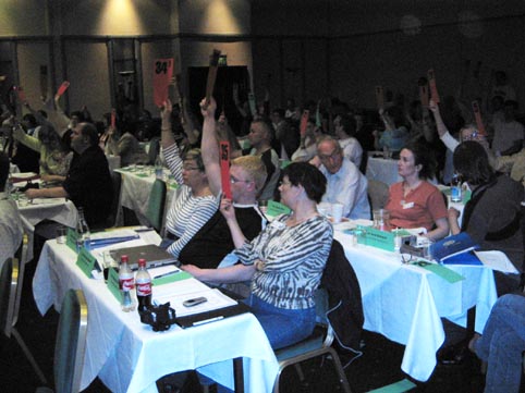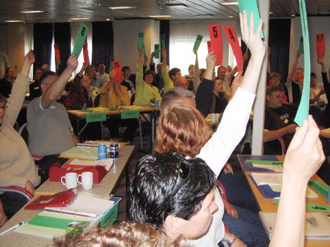 Her stemmes det over hvor landsmøtet skal holdes i 2007. Grønn = Steinkjer med Nord-Trøndelag Døveforening som teknisk arrangør. Rød = Molde med Møre og Romsdal Døveforening som teknisk arrangør. Resultat: 22 stemmer til Molde og 21 til Steinkjer!