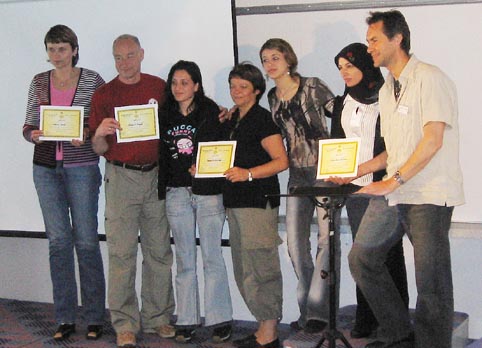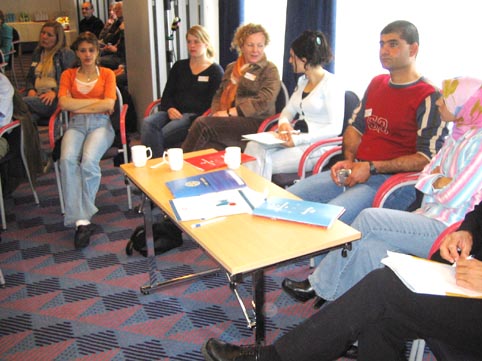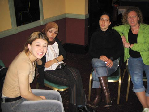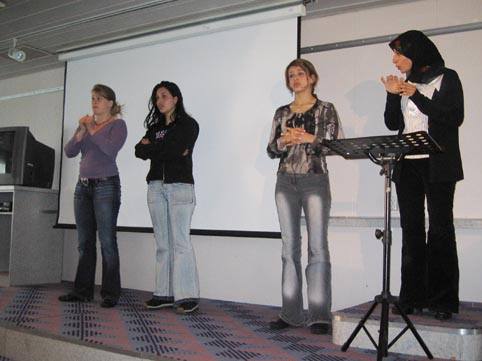 Palestinerne hilste og takket for at de fikk være med. Det ble masse nye opplevelser for dem. Hørselshemmet kvinne til høyre brukte arabisk tegnspråk, som så ble stemmetolket av kvinnen nr 2 fra høyre, og igjen oversatt til engelsk av kvinnen nr 2 fra venstre, som så ble oversatt til norsk tegnspråk av Nina Skogheim (til høyre).