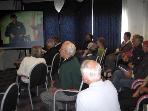 Lenger bak i konferanselokalet kunne turistene følge med på storskjerm.
