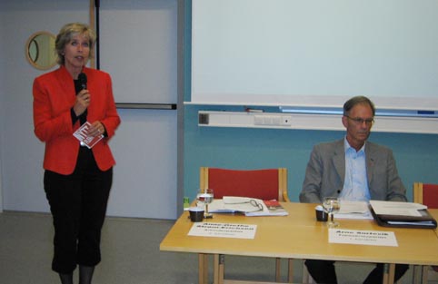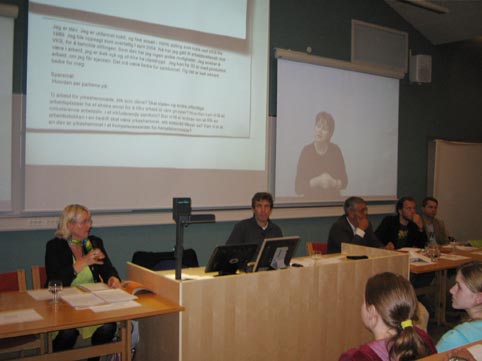 (Anne-Grethe Strøm-Erichsen (AP), til venstre på bildet, var den siste som hadde ordet (kort sluttord fra hvert parti). Hun sa at det var godt gjort av døveorganisasjonen å invitere til politisk debatt hvert annet år i flere år. - Det er det ikke mange organisasjoner som gjør, sa hun.)