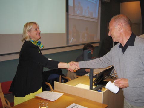 Politikerne fikk delt ut døvesenterets jubileumskrus som takk for frammøtet og innsatsen, delt ut av styreleder Toralf Ringsø.