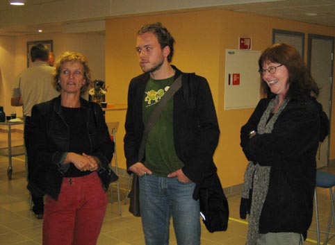 SV-politikeren Audun Lysbakken var sikkert begeistret over å høre ungjentenes mening. Han syntes ellers det var hyggelig å komme og presentere SVs saker og å bli kjent med saker som døve er opptatt av. Til venstre Ellinor Hjelmervik. Til høyre: Sissel Grønlie.