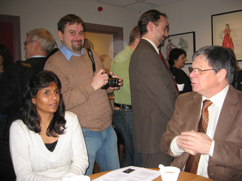 Døves Tidsskrifts redaktør Helge Herland (i hvit skjorte) intevjuer en av byråkratene (han med blomster) i departementet.