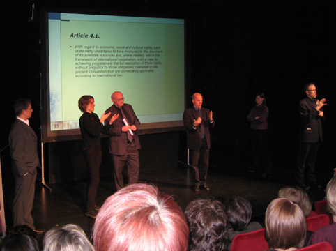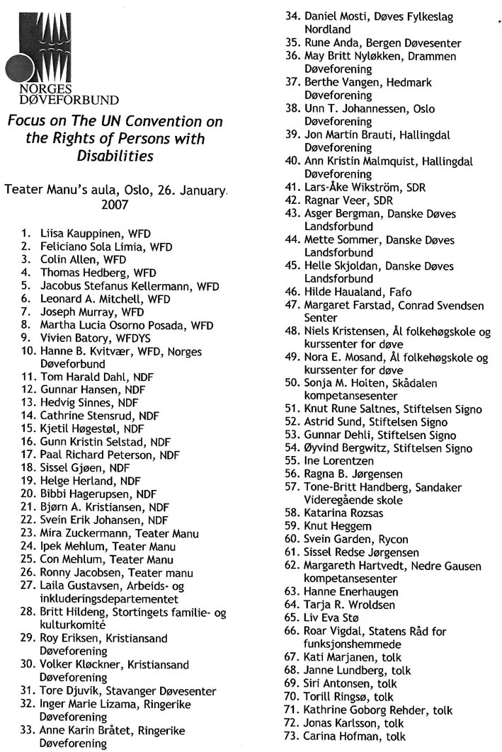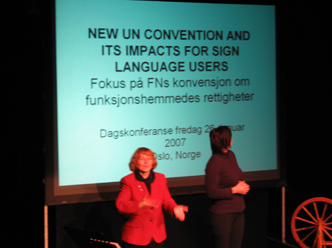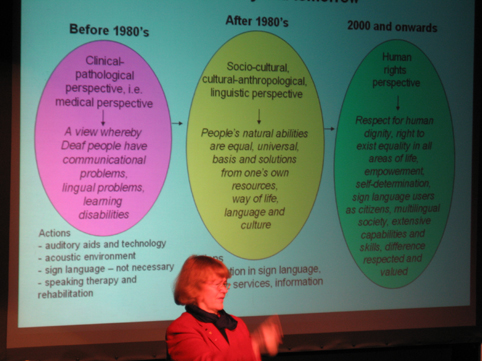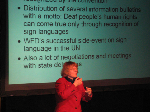 Liisa Kauppinen, president emeritus i WFD, foreleste over temaet: FNs konvensjon for funksjonshemmede i et språklig rettighetsperspektiv. Tegnspråk nevnes minst syv ganger i fem ulike artikler.