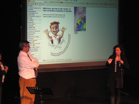 Til venstre: visepresident i WFD, Feliciano Sola Limia, orienterte om kommende verdenskongress i Madrid juli 2007. Til høyre: Ipek Dedeoglu Mehlum med spørsmål til visepresidenten.
