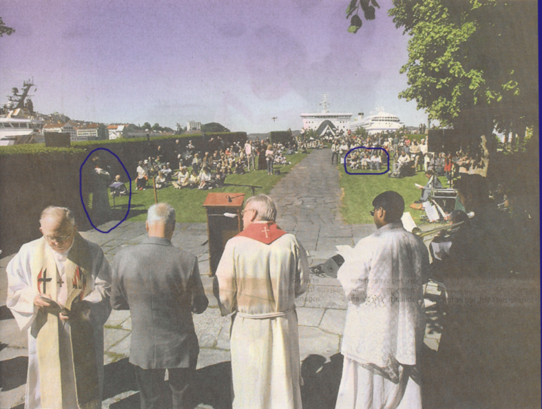 2. pinsedag, 5. juni 2006 i Kristkirketomten. Her ser vi døvekapellan Tom S. Tomren i skyggen og en gruppe døve ute på plenen i det fine været. Bildet er fra Bergens Tidende.