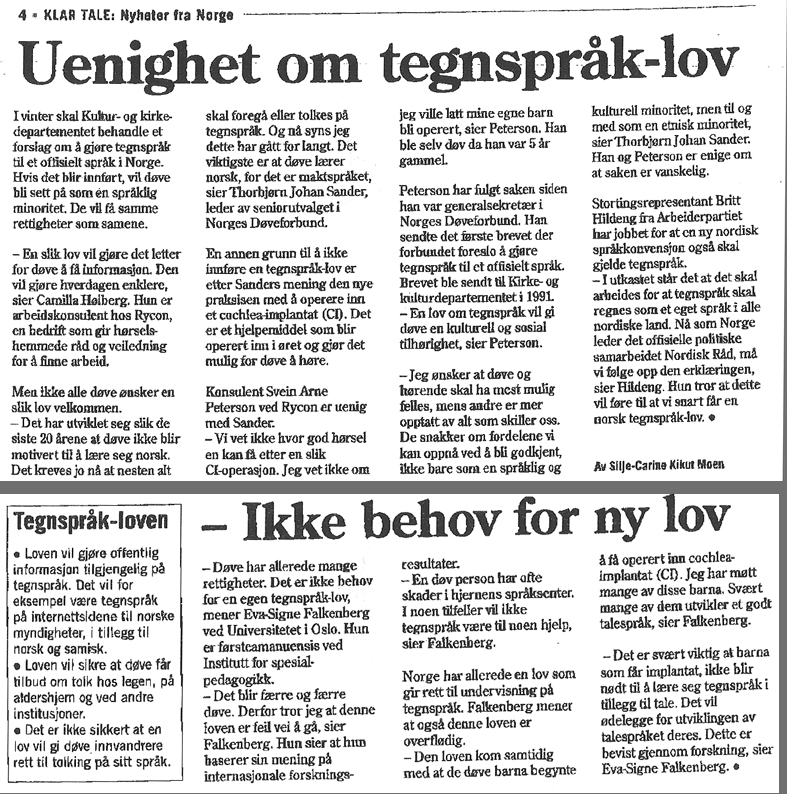 Thorbjørn Johan Sander sa (til oss) at han uttalte seg som privatperson, ikke som leder i Norges Døveforbunds seniorutvalg slik artikkelen kanskje kan gi inntrykk av. Vi vet at Norges Døveforbund arbeider for at tegnspråk skal bli et offisielt språk i Norge, og at man ønsker innføring av en tegnspråklov.